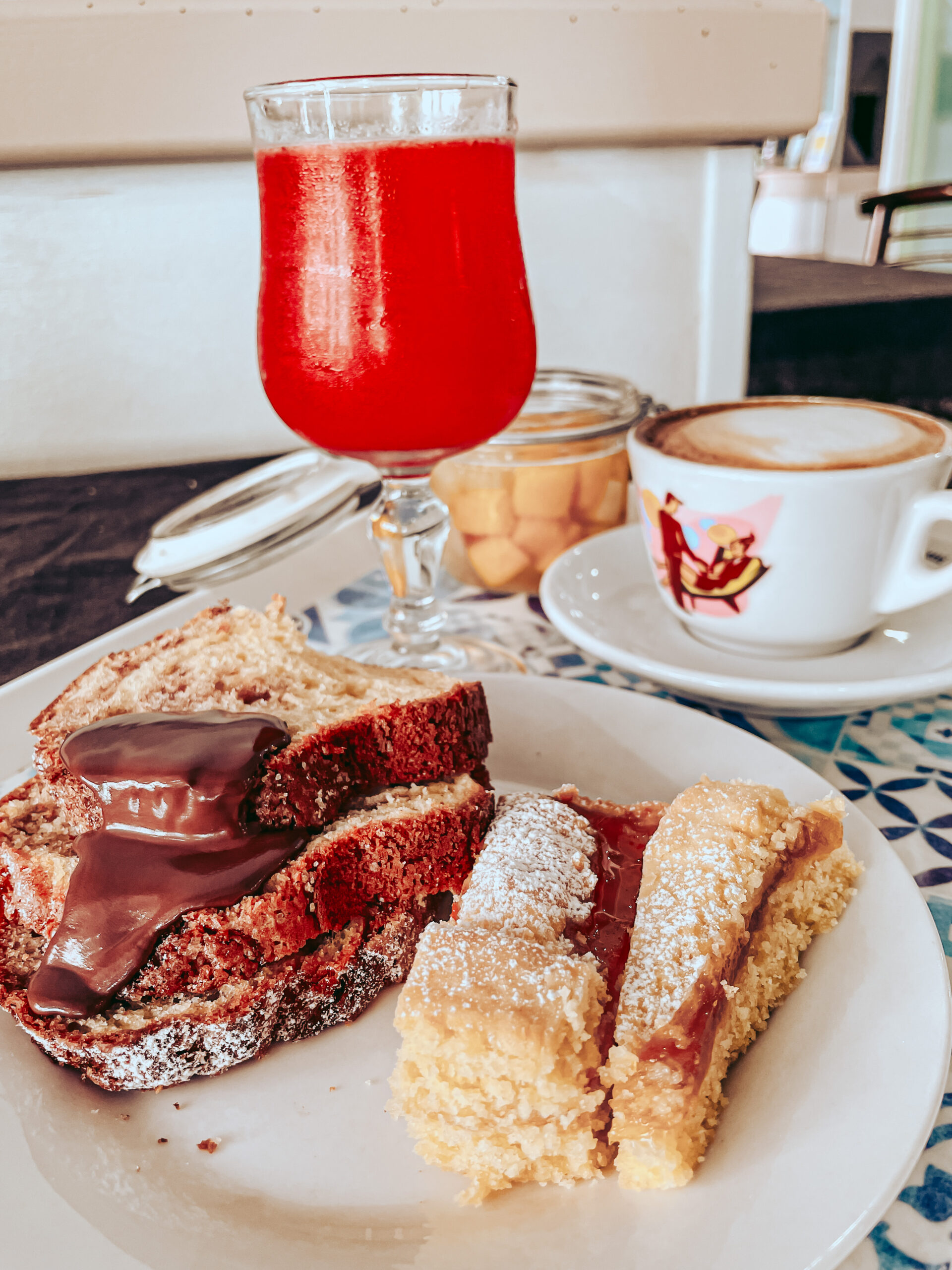 Crostate, ciambelle, torte del giorno, brioches, yogurt con cereali, succhi di frutta, uova, affettati e formaggi